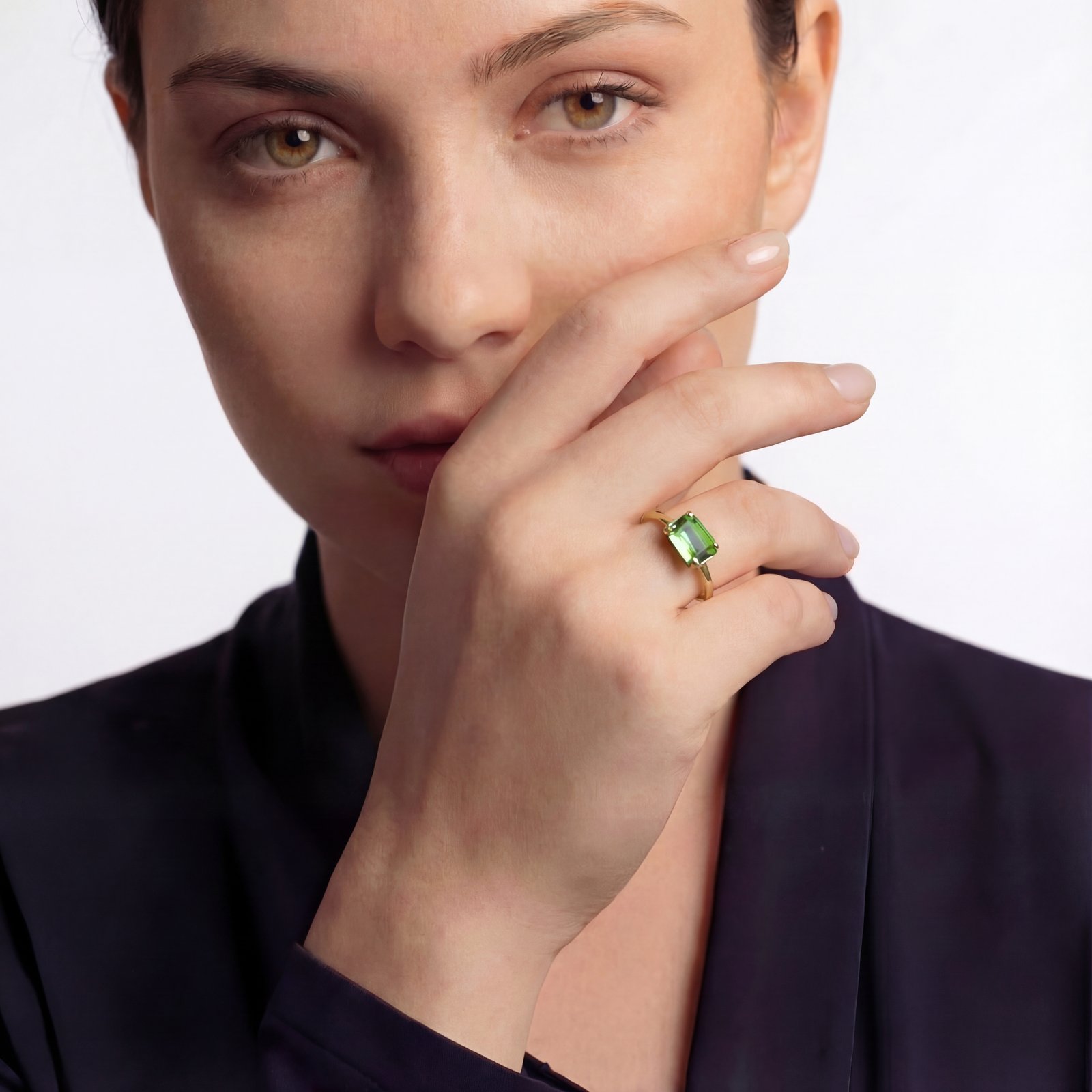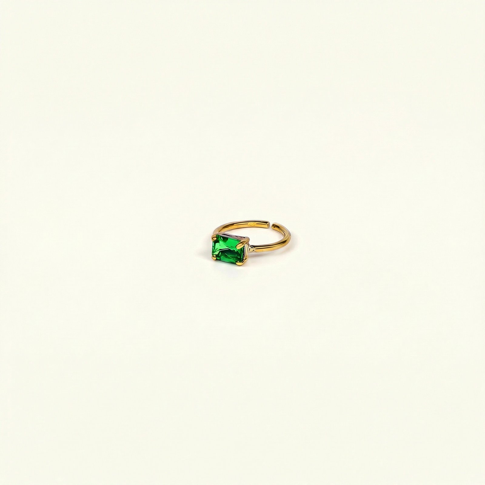 A minimalist open ring in polished copper, set with a vivid emerald‑green rectangular gemstone that adds a refined flash of color to any look