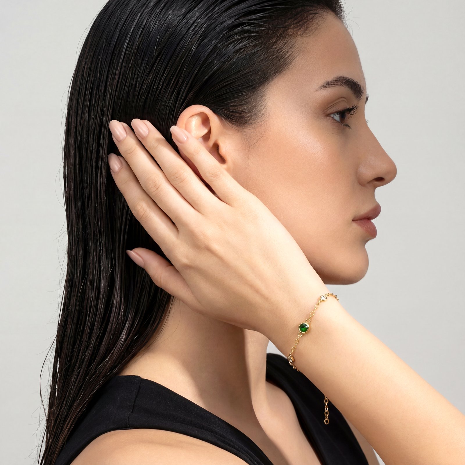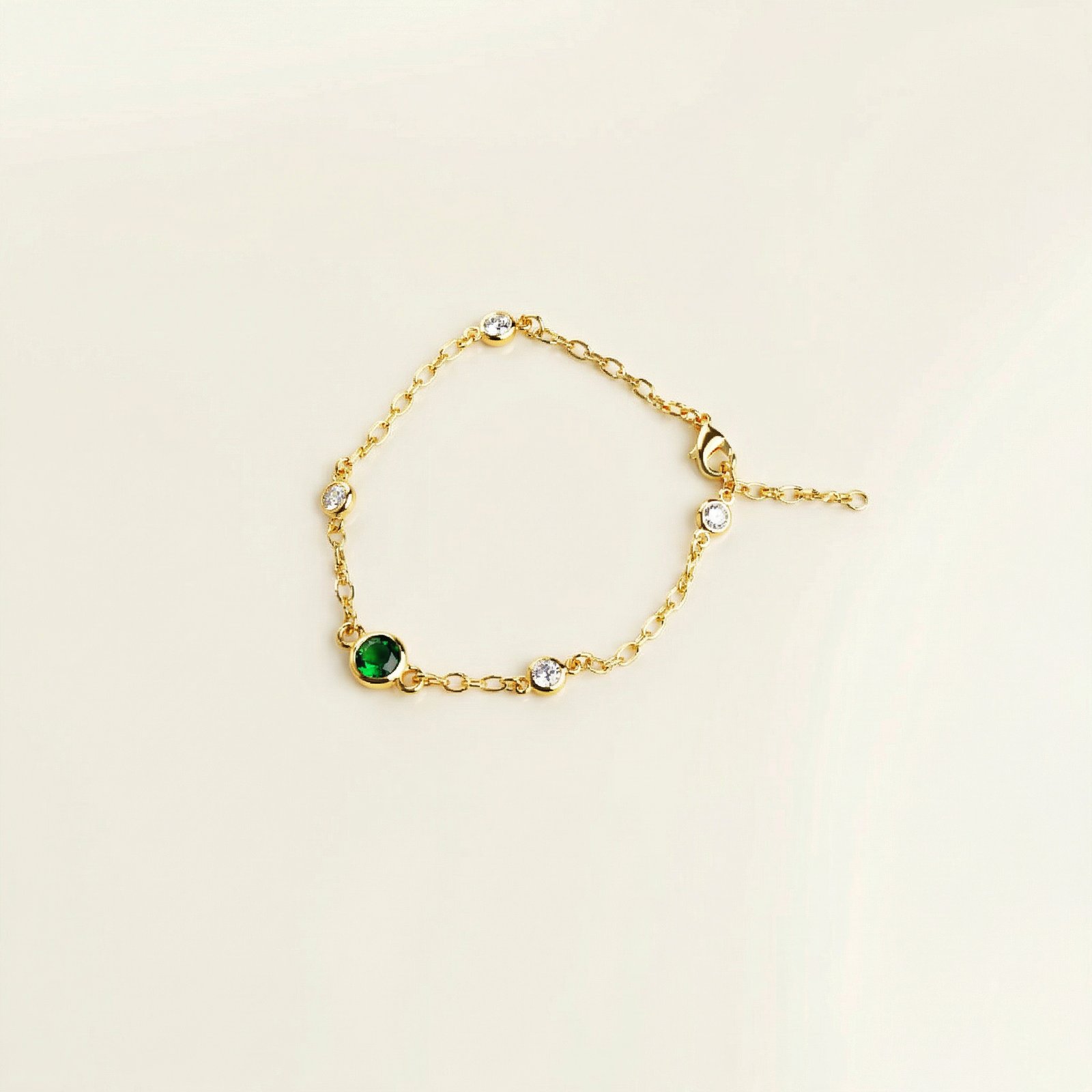 A delicate gold‑tone copper bracelet featuring a central emerald‑green stone accented with sparkling clear crystals, perfect for adding a refined pop of color to your everyday or evening looks.