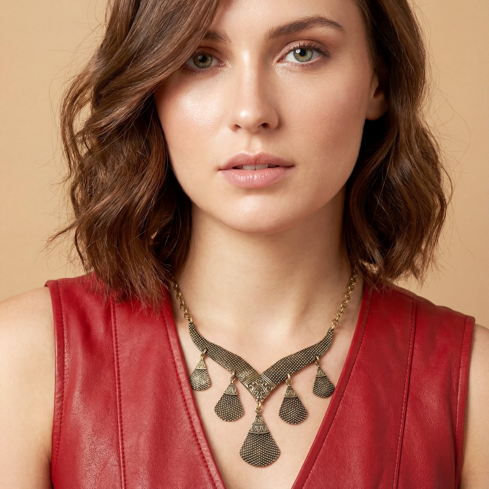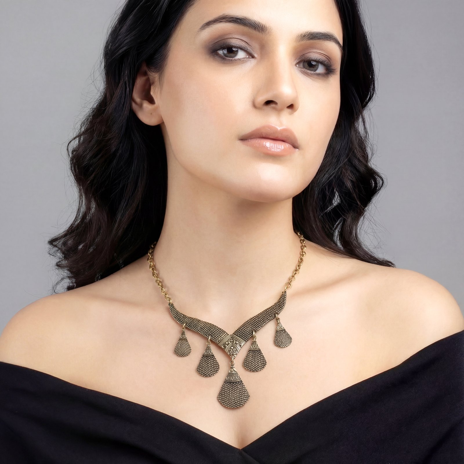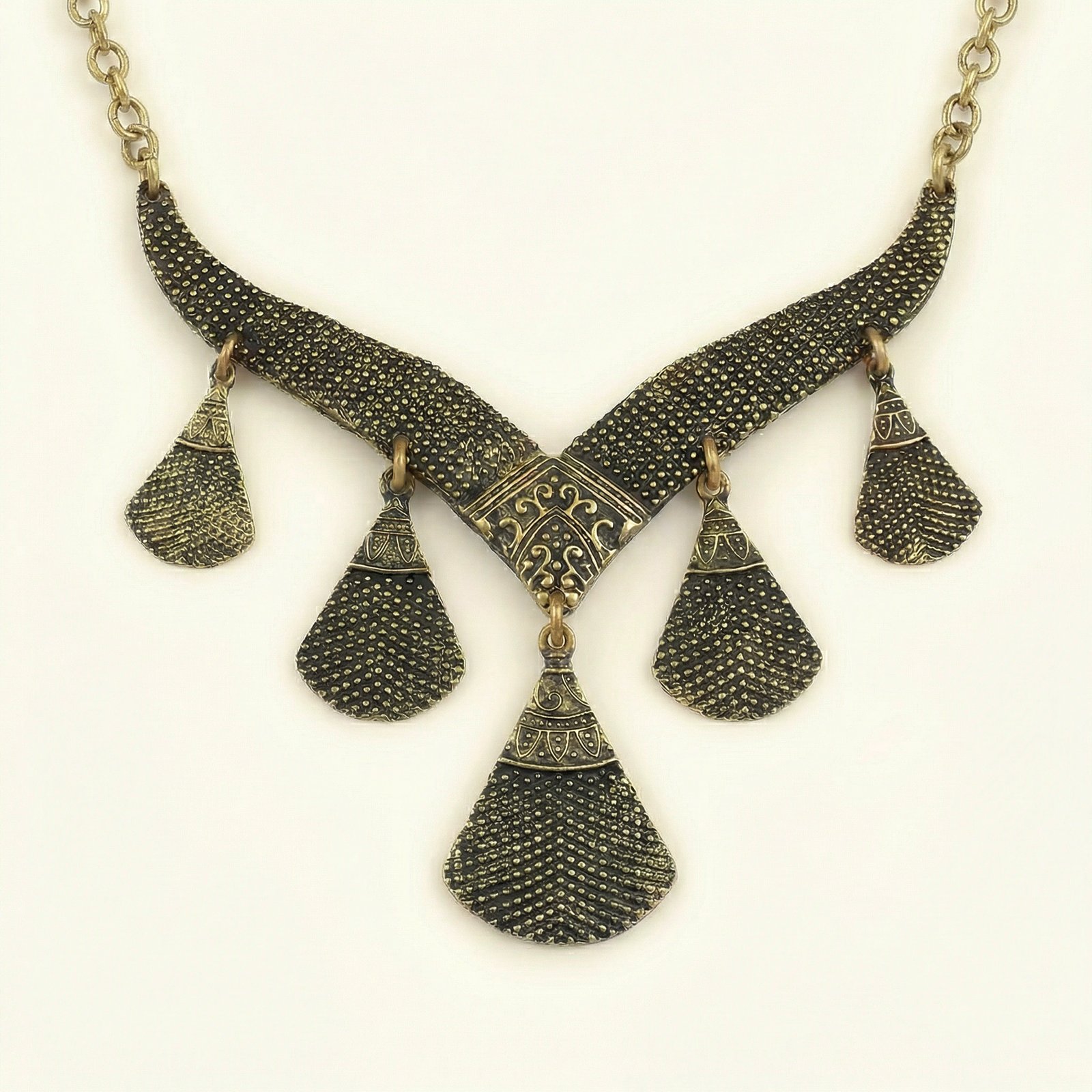 A textured V‑shaped necklace crafted in gold‑tone copper, featuring dangling leaf motifs that create a dramatic, bohemian fringe effect.